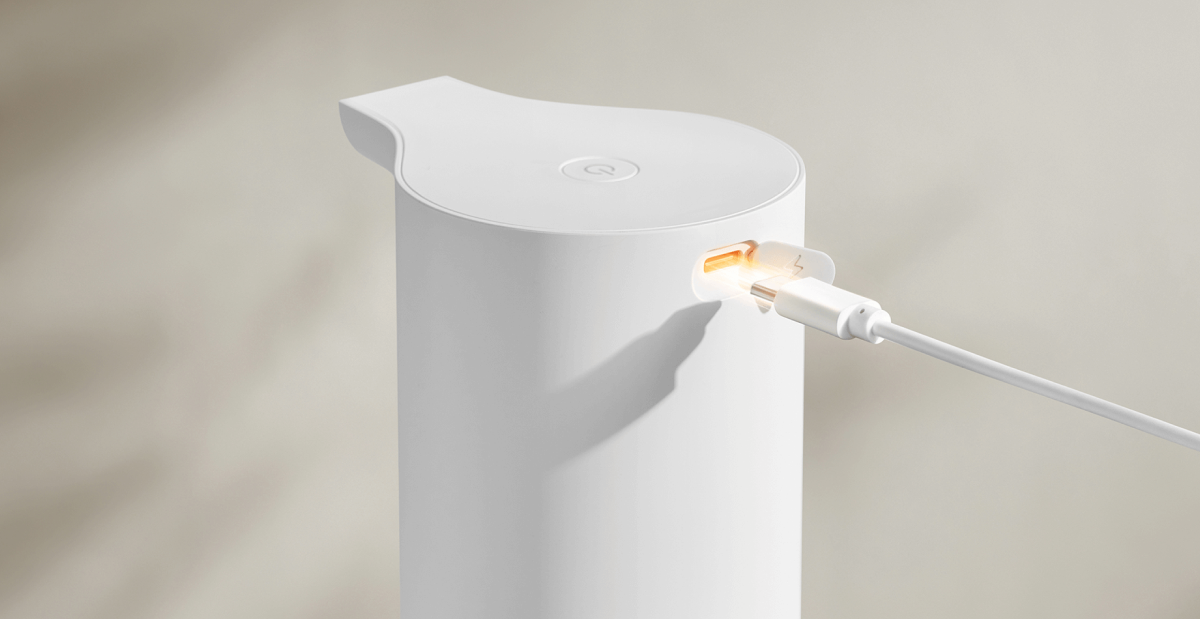 Устройство работает от встроенного аккумулятора и не нуждается в постоянном подключении к сети. Корпус имеет влагозащиту уровня IPX5, что позволяет безопасно использовать диспенсер рядом с водой.